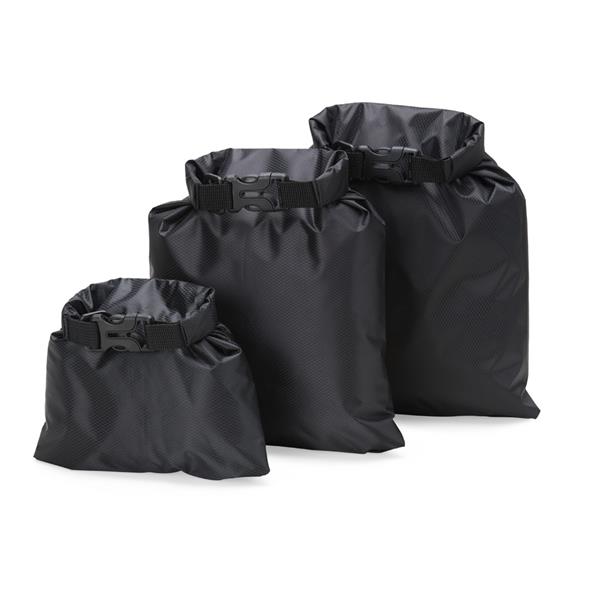 Kit com 3 sacos em nylon impermeável com fechamento por fivelas. Gravação da logomarca em 1 cor já inclusa.