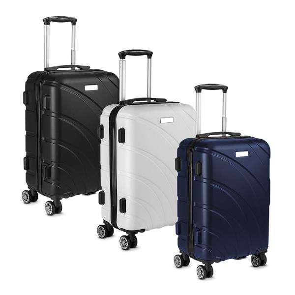 Mala de bordo em plástico ABS; Abertura frontal com zíper para acesso ao interior da mala; Forro poliéster; Sistema de carrinho de aço; Alça de mão na lateral e na parte superior; Quatro rodas de 360 graus; Acompanha Plaquinha de metal sem personalização. Mala perfurada para aplicação da plaquinha. Gravação da logomarca a laser já incluso.