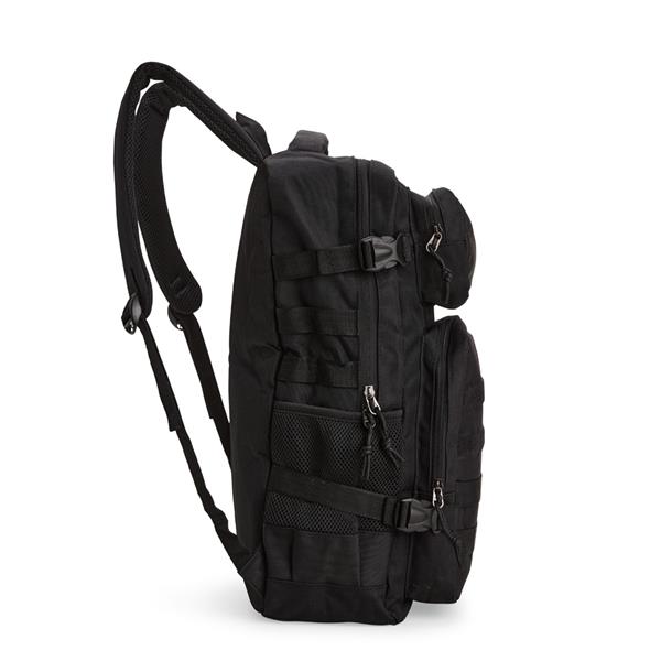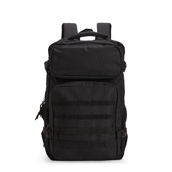 Mochila em Oxford 600D impermeável, fechamento em zíper com fechamento em zíper e puxadores em cordão de nylon, e capacidade de 24 litros. Possui divisória interna para notebooks de até 15,6 polegadas. Conta com dois compartimentos frontais de tamanhos diferentes, sendo um com tiras em velcro para fixação de patches e costura compatível com o encaixe de bolsos modulares, além de dois bolsos laterais em tela de nylon com elástico e cintas compressoras laterais. Dispõe ainda de alça superior e duas alças acolchoadas para as costas. Acompanha plaquinha metálica personalizável. Gravação da logomarca em 1 cor já inclusa.