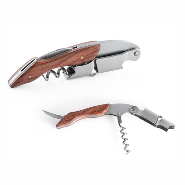 Saca Rolhas em madeira e aço inox. Com sistema de mola para extração em duas fases. Com canivete de escanção. Fornecido em caixa de oferta em papel Kraft. A cor e o resultado da impressão nos materiais naturais pode variar entre produtos. Gravação da logomarca a laser já incluso.